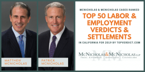 Partner Matthew McNicholas’ $750,000 settlement (Cordero v. County of Los Angeles) and Partner Patrick McNicholas’ $842,000 verdict (Thompson v. City of Pasadena) were ranked on TopVerdict.com’s Top 50 Labor & Employment Verdicts in California in 2019.